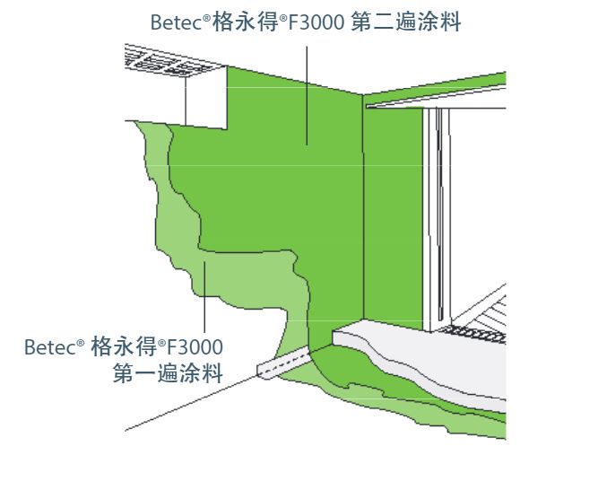 最低使用温度为5ºC。Betec格永得F3000应分遍涂刷。在20ºC温度下,一旦材料混合后,涂料必须在大约40分钟内用完。施工时,先进行节点部位加强处理,然后可进行大面积施工。每遍涂刮方向应与前一遍相互垂直。根据厚度及环境条件的不同,每遍涂料涂刷后,完全干固时间约为6-16小时,待上一遍涂料干固后,再涂刷下一遍。